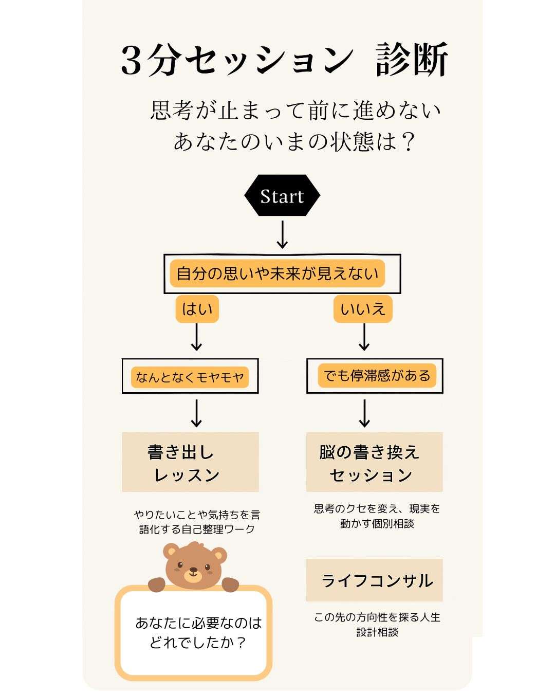 そんなお声を、とても多く頂きます。ご希望の方にはご提案書やお薦めの講座をマッチングしますとお伝えしておりますが、「提案を受けてしまうと断りにくい」と思われている方も多いようで、気軽にご相談頂きにくいように感じておりました。そこで、今回試験的に1週間限定で先着20名の方に特別価格でプログラムをご体験頂くことに致しました。必要なプログラムがどれなのか、セルフチェックできる診断チャートを作成致しました。こちらをご活用頂き、ご希望のプログラムをぜひご体験下さい。1週間限定通常の2~30%オフでのご提供となります。先着順となりますので、ご希望のものがございましたらこのチャンスにぜひご体験下さいませ。