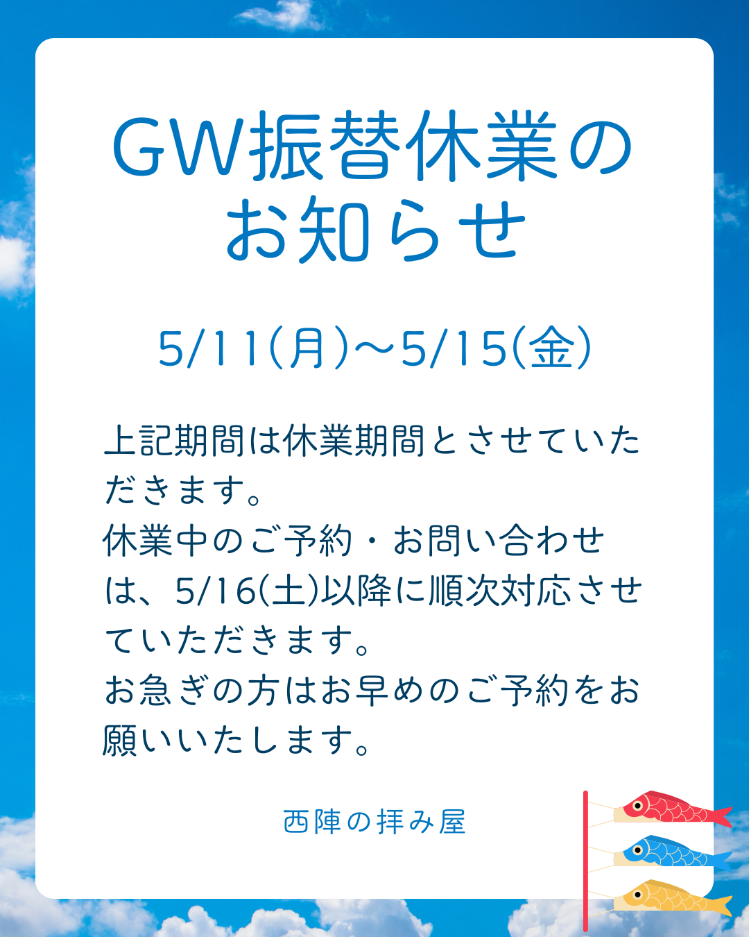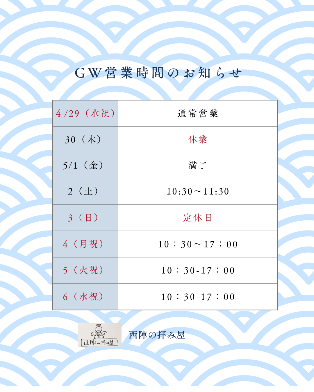 GW振替休業のお知らせ 2026/04/06 いつも西陣の拝み屋にご縁を下さりありがとうございます。 以下の日程でGWの振替え休業とさせて頂きます。 5/10(日)神奈川出張営業 5/11(月)~13(水)介護休暇 5/14(木)~15(金)GW振替休業 上記期間は休業期間とさせていただきます。 休業中のご予約・お問い合わせは、5/16(土)以降に 順次対応させていただきます。 お急ぎの方はお早めの ご予約をお願いいたします。 ご不便をおかけしますが、よろしくお願い致します。 お問い合わせはこちら